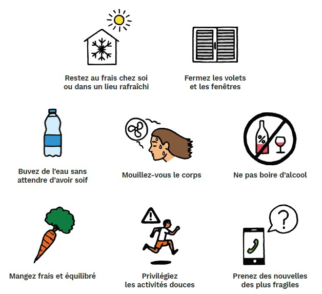 En cas de fortes chaleurs ou d’alerte canicule, certains réflexes sont à adopter pour éviter le coup de chaud ou le malaise :