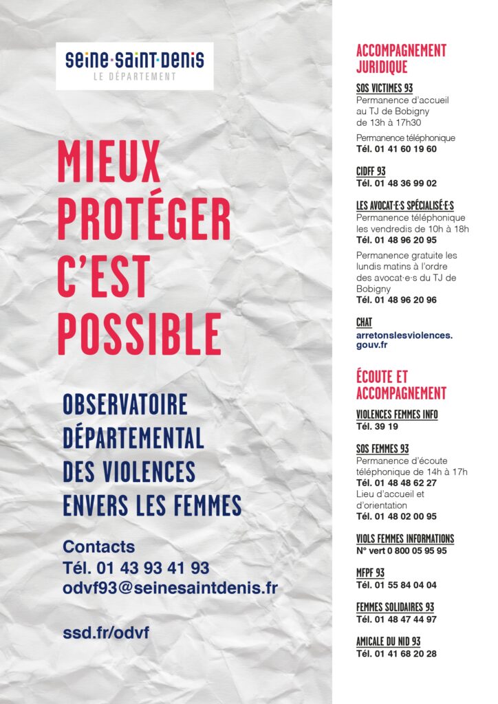 En Seine-Saint-Denis, vous pouvez aussi contacter l’Observatoire départemental des violences envers les femmes, qui propose un accompagnement spécialisé.