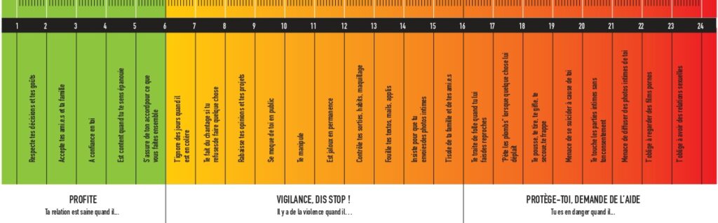 En cas de doute, n’hésitez pas à utiliser le violentomètre, un outil simple qui permet d’évaluer la gravité des comportements au sein d’une relation.